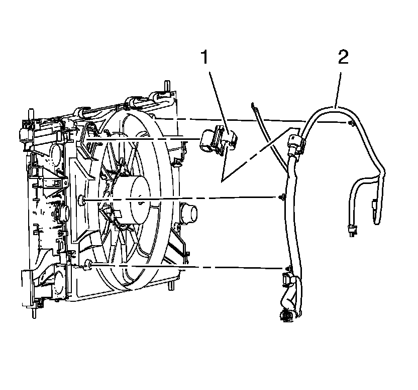 4. Install the engine coolant fan resistor (1) by clipping the retainer clip (2).
