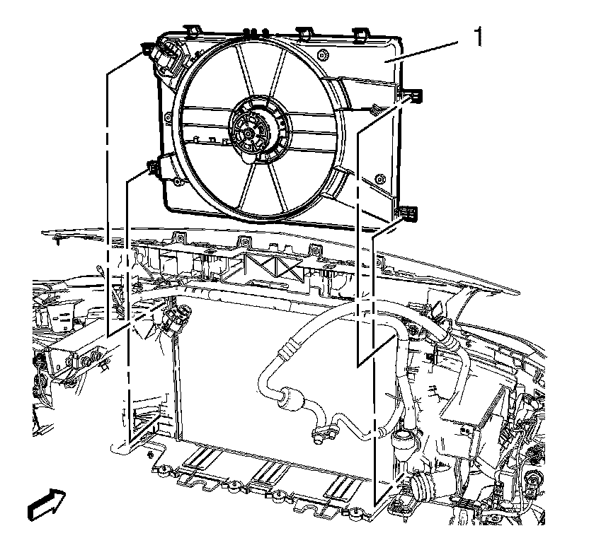 1. Lower the right hand side of the engine coolant fan shroud (1) behind the radiator.