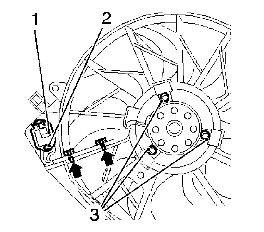 3. Clip in the engine coolant fan resistor wiring harness (arrows) to the shroud.