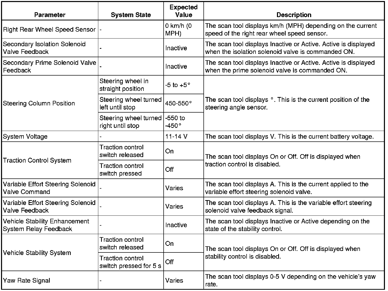 The electronic brake control module (EBCM) scan tool data parameters list contains all ABS related parameters that are available on the scan tool. The list is arranged in alphabetical order. A given parameter may appear in any one of the data lists.