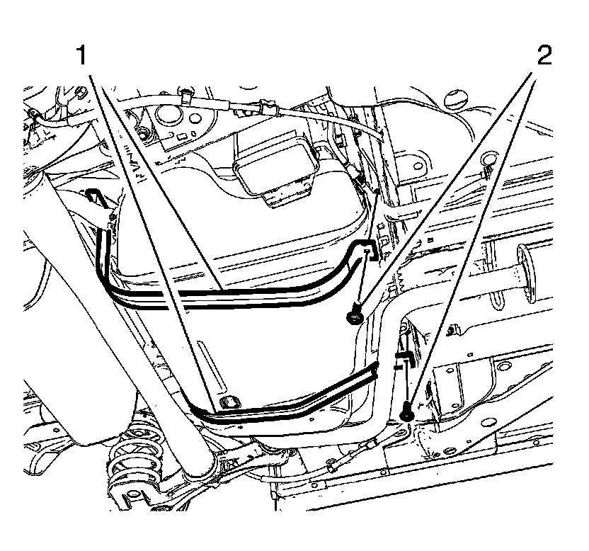 3. Install the 2 fuel tank strap bolts (2) and tighten to 22 Nm (16 lb ft).