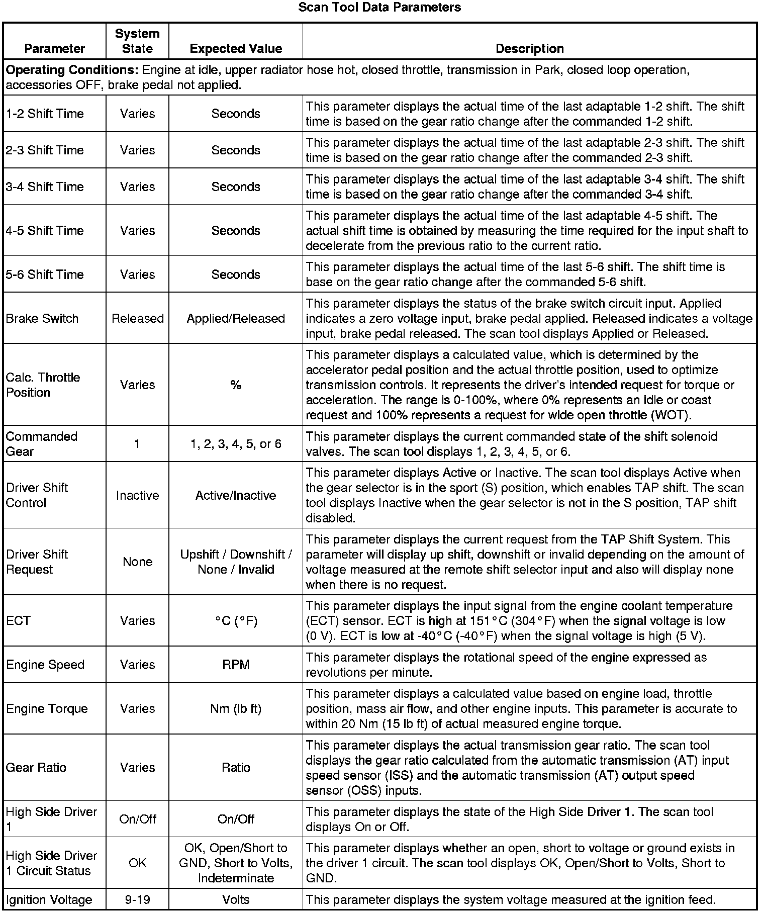 The Transmission Control Module Scan Tool Data List contains all transmission related parameters that are available on the scan tool. The list is arranged in alphabetical order. A given parameter may appear in any one of the data lists, and in some cases may appear more than once, or in more than one data list in order to group certain related parameters together.