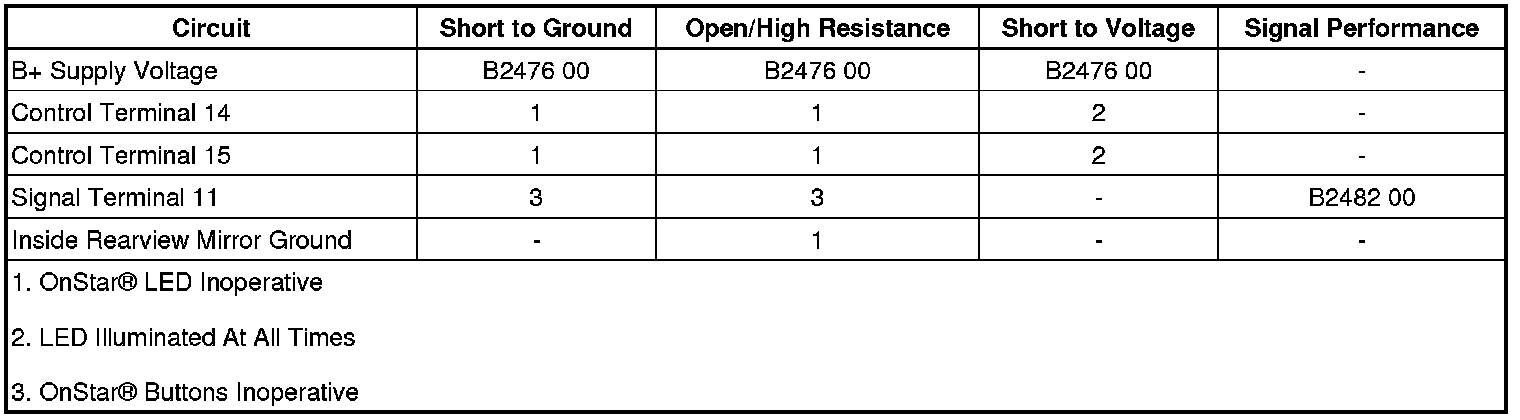 The OnStar(R) button assembly consists of 3 buttons, Call/Answer, OnStar(R) Call Center, and OnStar(R) Emergency. The communication interface module (CIM) supplies the OnStar(R) button assembly with 10 V via the keypad supply voltage circuit. Each of the buttons, when pressed, completes the circuit across a resistor allowing a specific voltage to be returned to the CIM over the keypad signal circuit. Depending upon the voltage range returned, the CIM is able to identify which button has been activated.