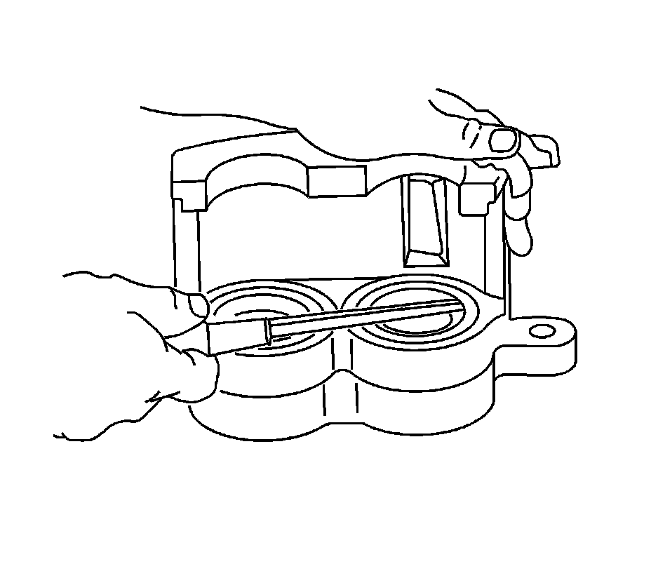 When applying the clean brake fluid to the piston bores and pistons, only apply the brake fluid to one bore at a time. This is done to ensure that the brake caliper, seals and pistons DO NOT become contaminated with dirt or other foreign material.