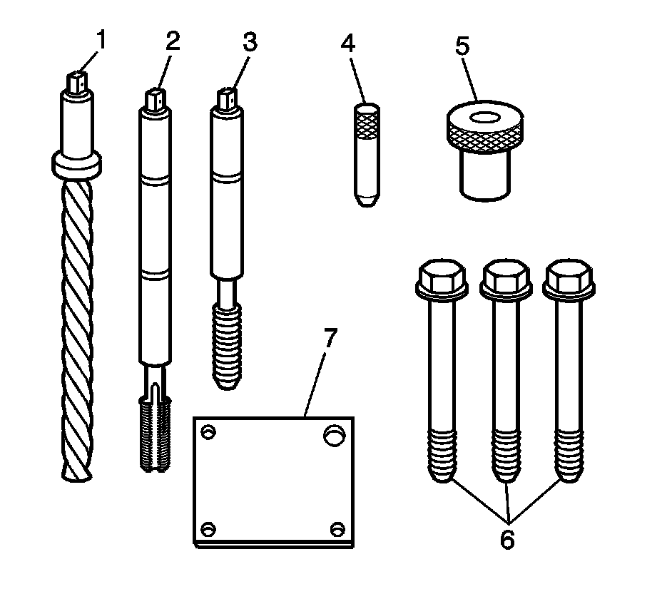 1. Position the fixture plate (3) with the bushing (2) installed over the crankshaft main cap bolt hole to be repaired.