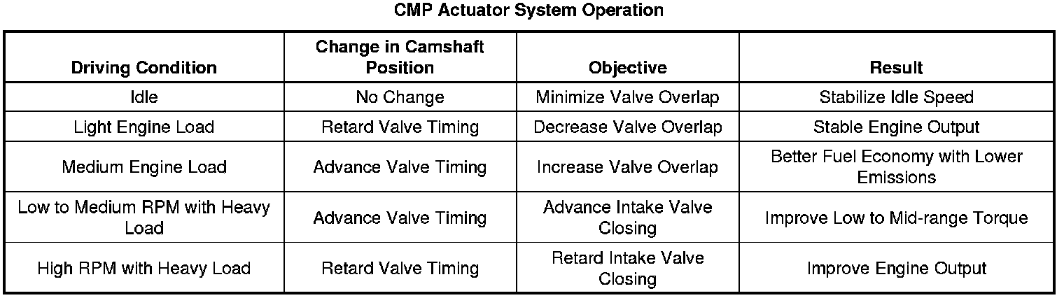 The camshaft (CMP) actuator system enables the engine control module (ECM) to change camshaft timing of all camshafts while the engine is running. The CMP actuator assembly varies the camshaft position in response to directional changes in oil pressure. The CMP actuator solenoid valve controls the oil pressure that is applied to advance or retard a camshaft. Modifying camshaft timing under changing engine demand provides better balance between the following performance concerns:
