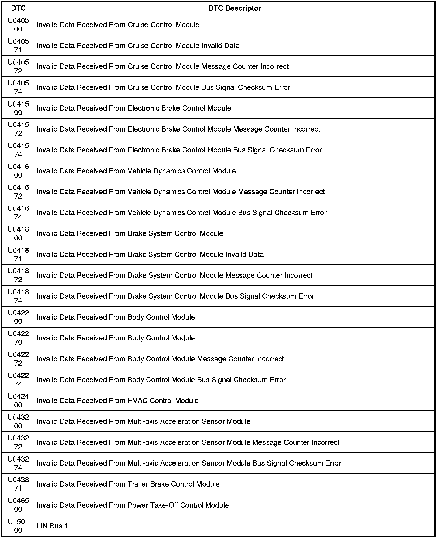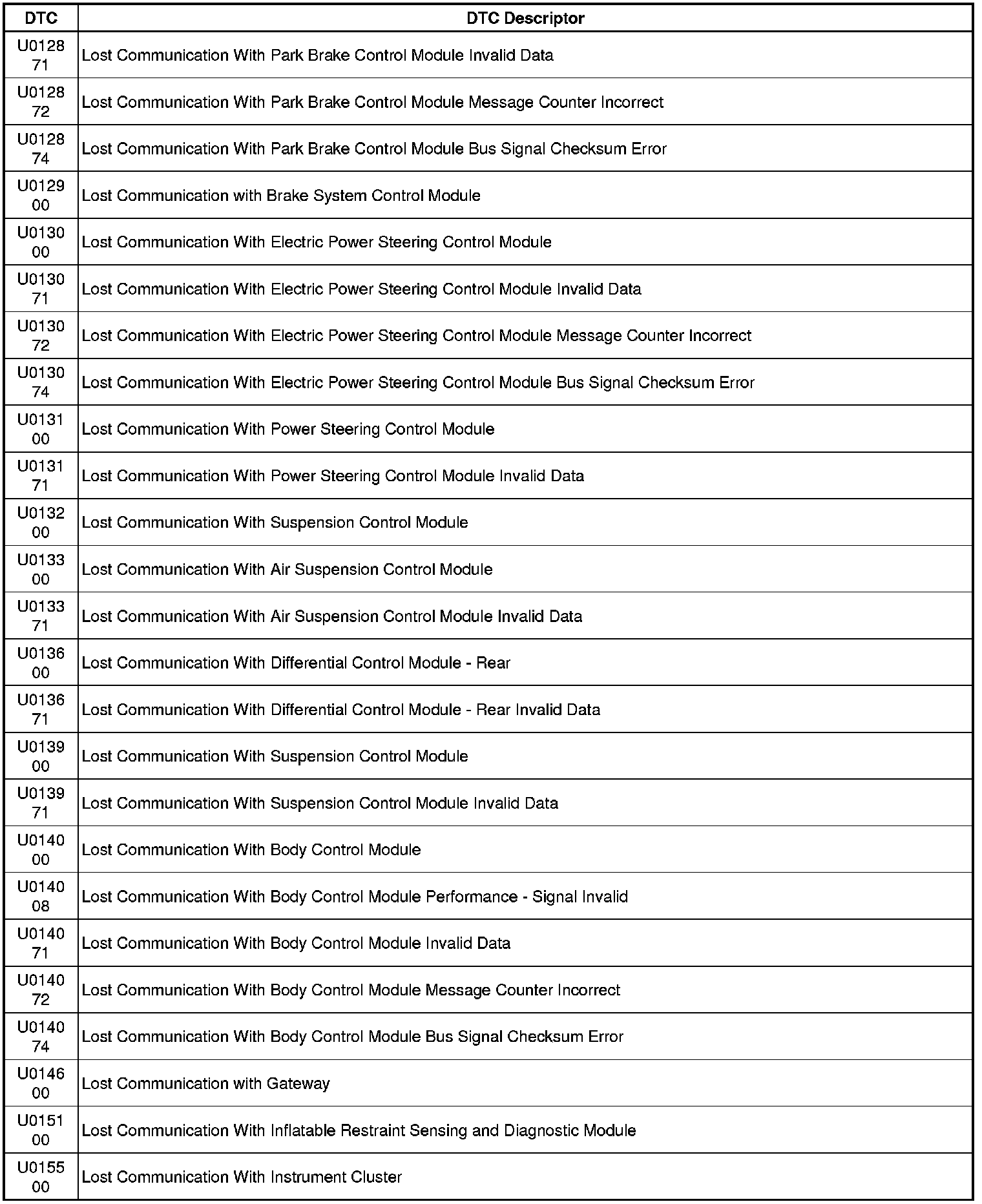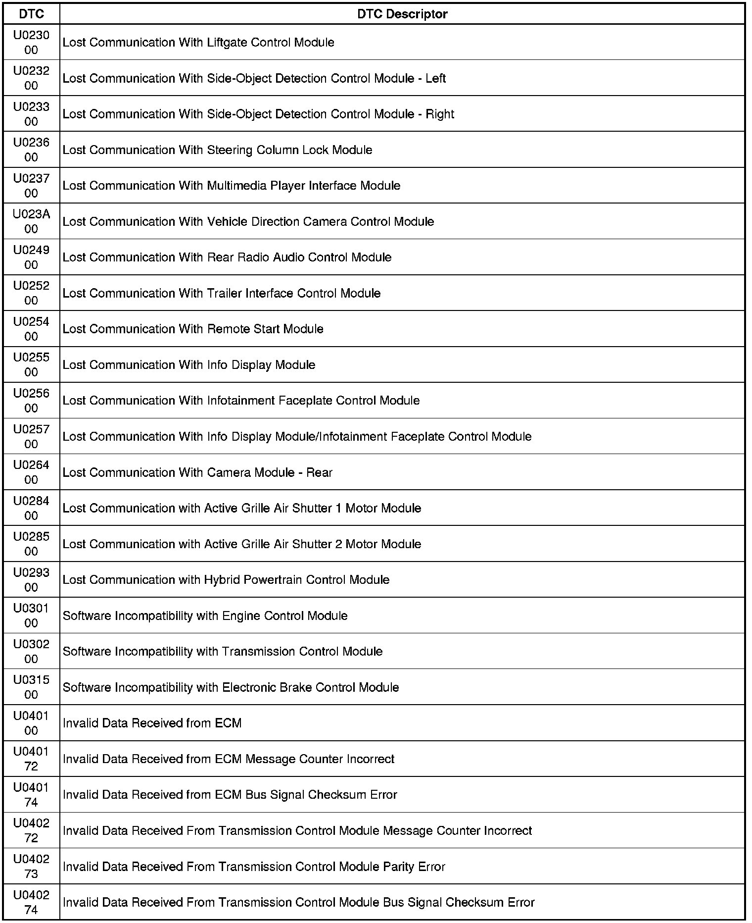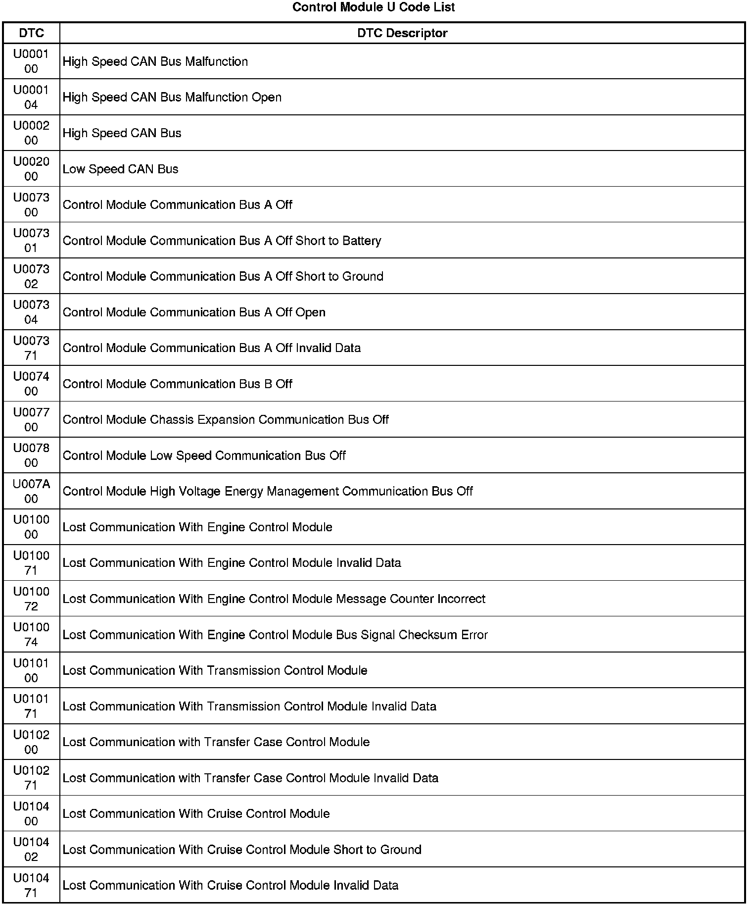 This list includes all Data Communications related U-code DTCs in alphanumeric order with descriptors for all modules. Not all DTCs listed will be applicable to all vehicles.