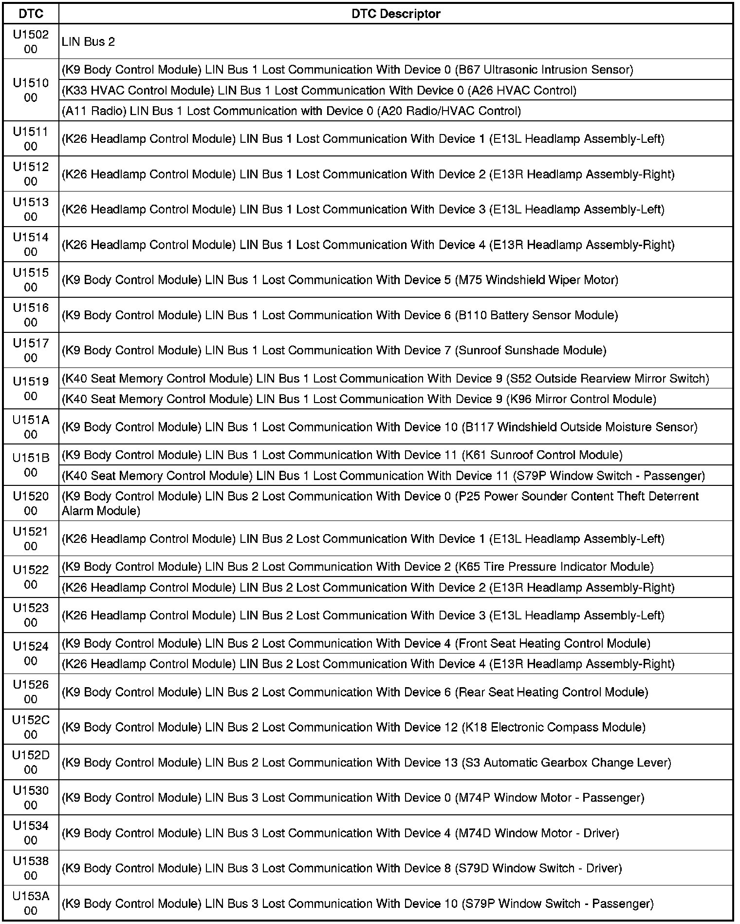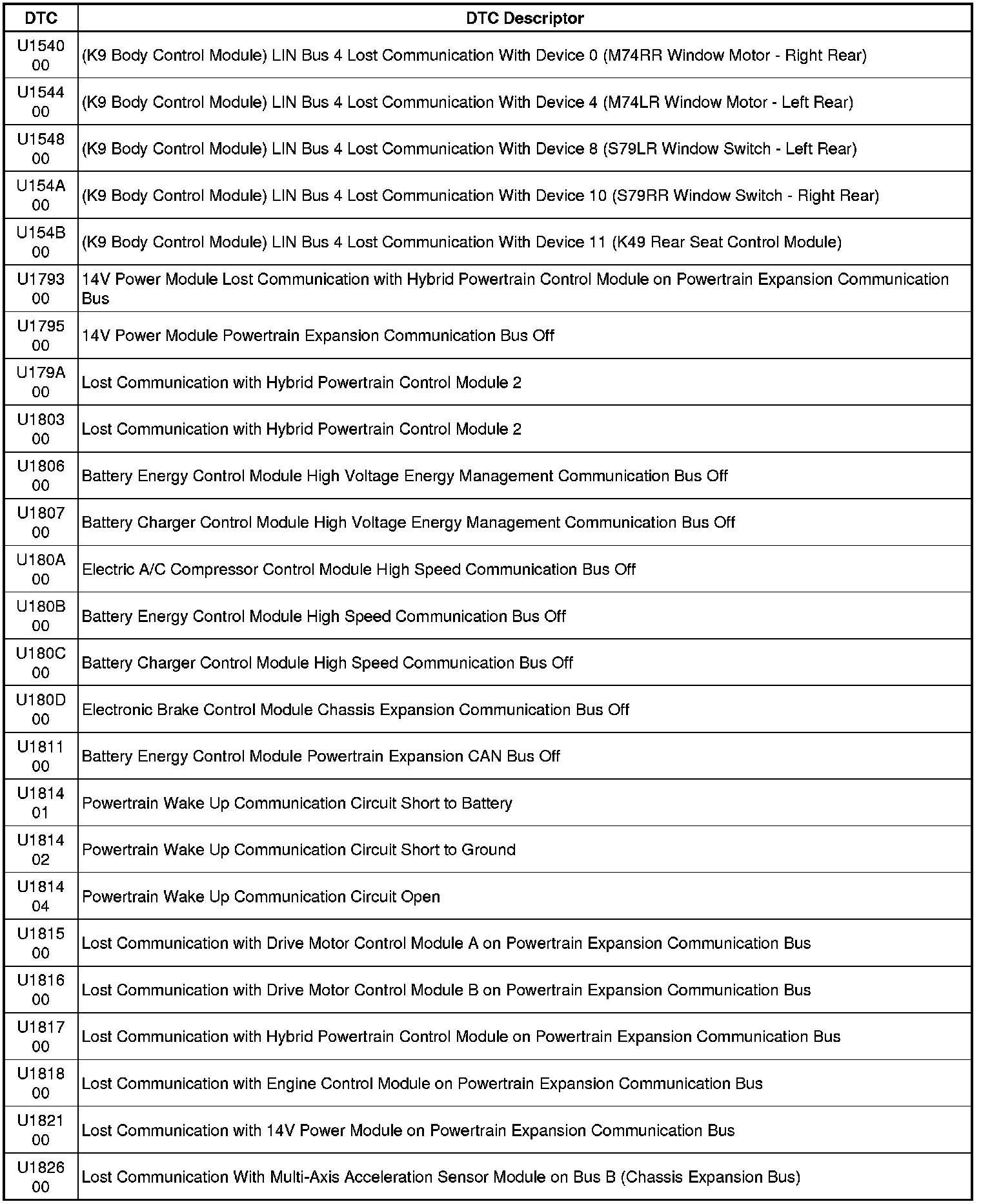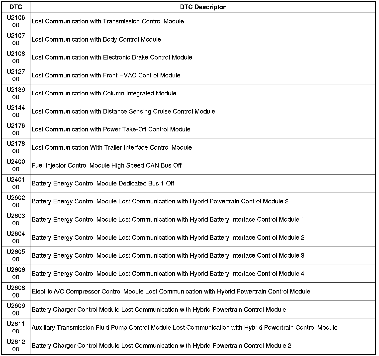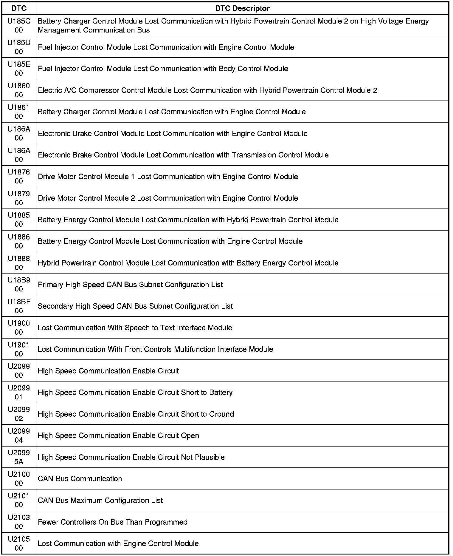 This list includes all Data Communications related U-code DTCs in alphanumeric order with descriptors for all modules. Not all DTCs listed will be applicable to all vehicles.