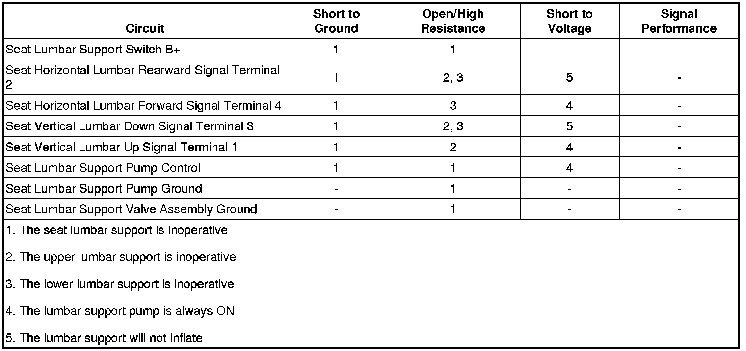 Battery voltage is supplied at all times to the driver seat lumbar support switch through a 15 A fuse located in the underhood fuse block. When a lumbar switch is pressed to inflate the lumbar support, battery voltage is applied through the switch contacts and the inflate control circuit to the seat lumbar support valve assembly. In response to this signal, the lumbar support valve assembly energizes its internal inflate solenoid and applies battery voltage through the seat lumbar support pump control circuit to the pump. The pump runs to inflate the appropriate lumbar bladder until the switch is released. When the switch is pressed to deflate the lumbar support, battery voltage is applied through the switch contacts and the deflate signal circuit to the lumbar support valve assembly. The lumbar support valve assembly energizes its internal deflate solenoid and air is released from the bladder until the switch is released.