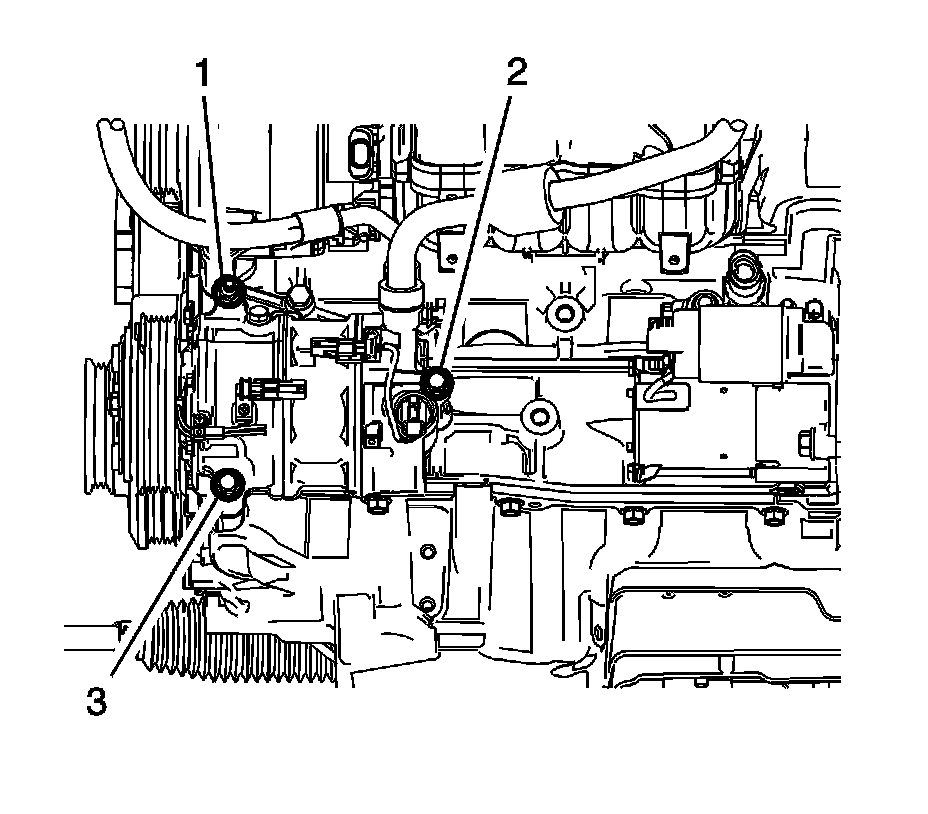 6. Install the A/C Compressor bolts (2) and (3) and nut (1) and tighten bolt to 20 Nm (15 lb ft)