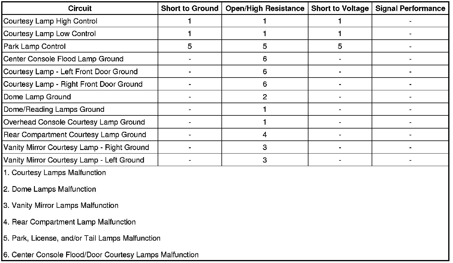 • If the courtesy lamps do not illuminate when commanded, refer to Overhead Illuminated Entry Lamps Malfunction.