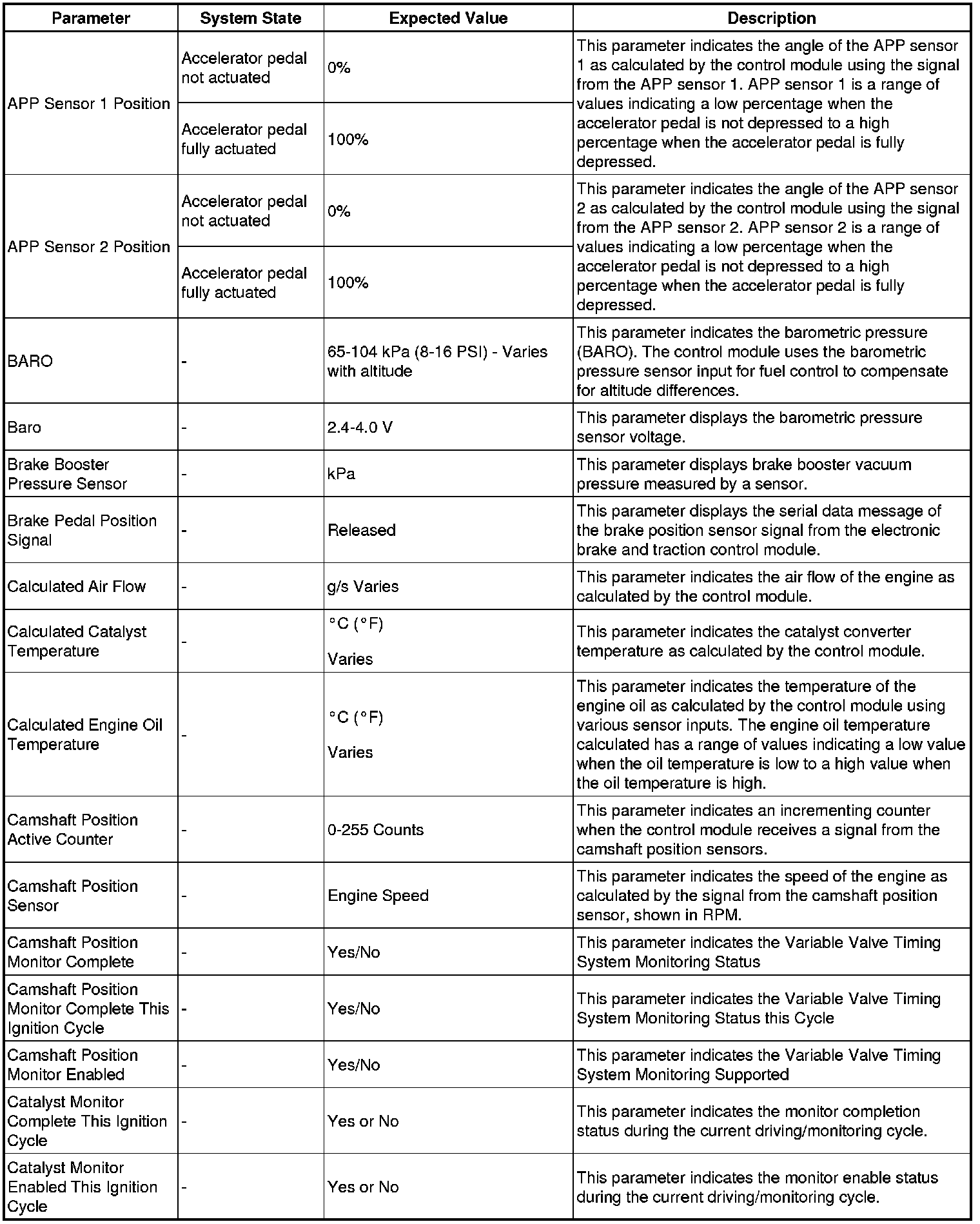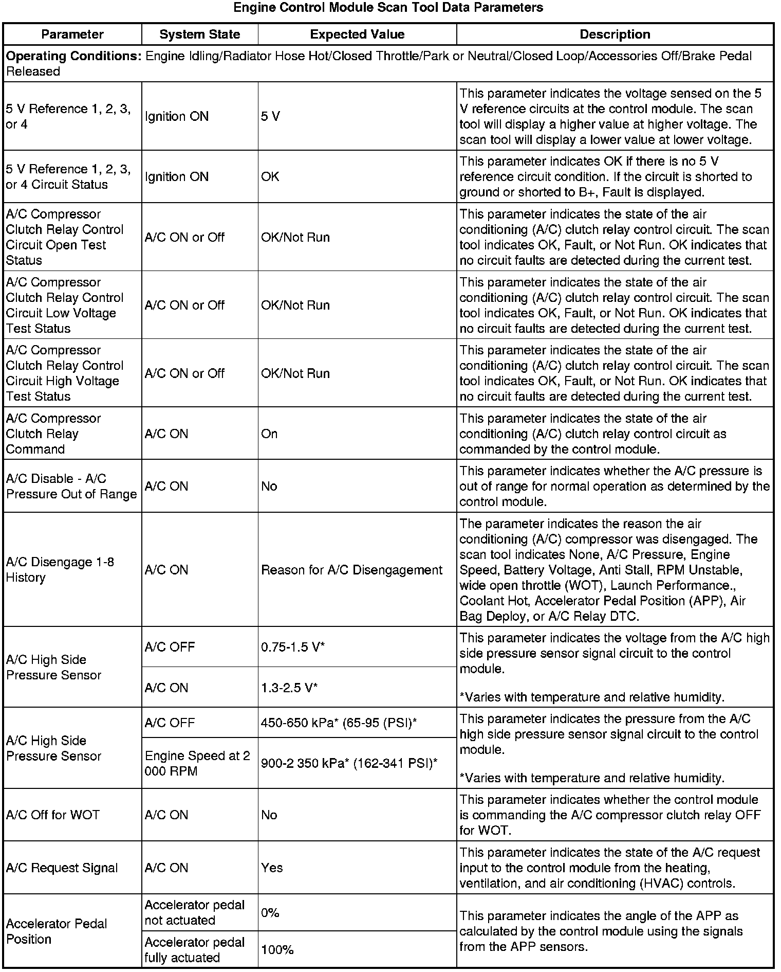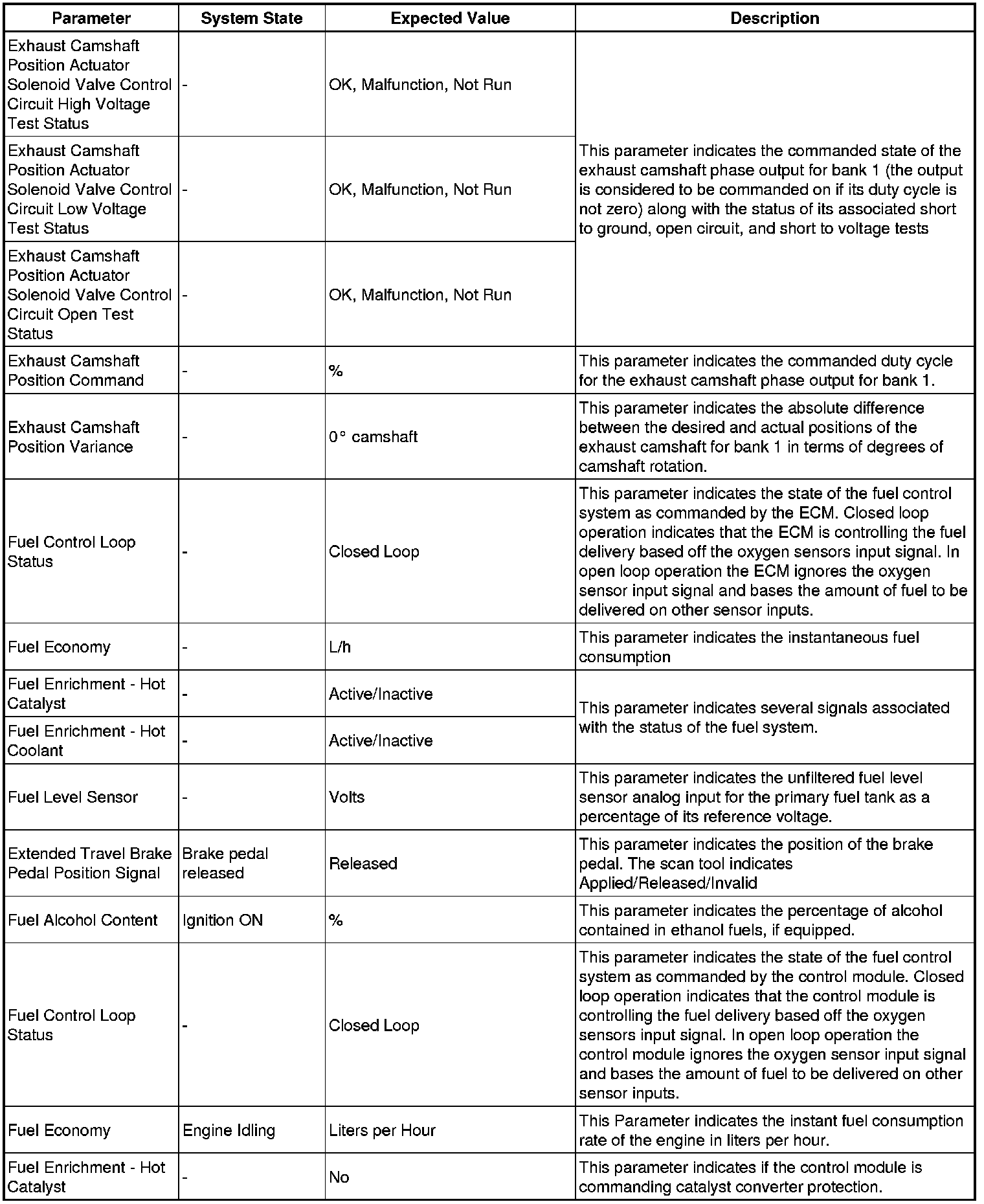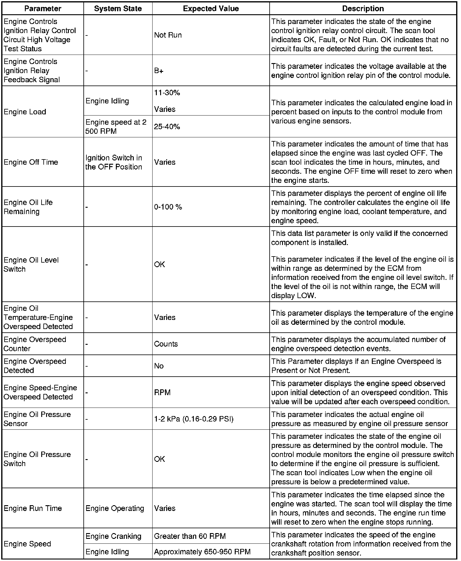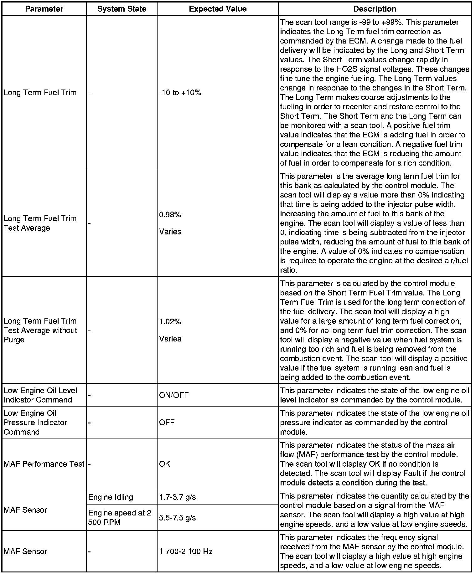 The engine control module scan tool data list contains all engine related parameters that are available on the scan tool. The list is arranged in alphabetical order. A given parameter may appear in any one of the data lists, and in some cases may appear more than once, or in more than one data list in order to group certain related parameters together.