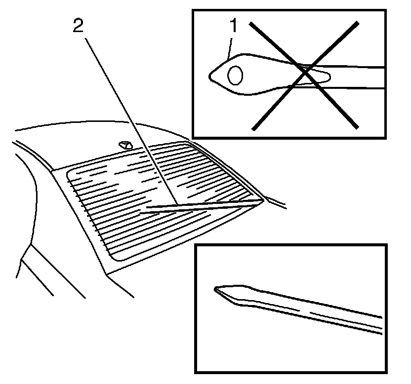 * When pulling through, keep the flat side of the awl "tip" (1) parallel with the edge of the rear window replacement.