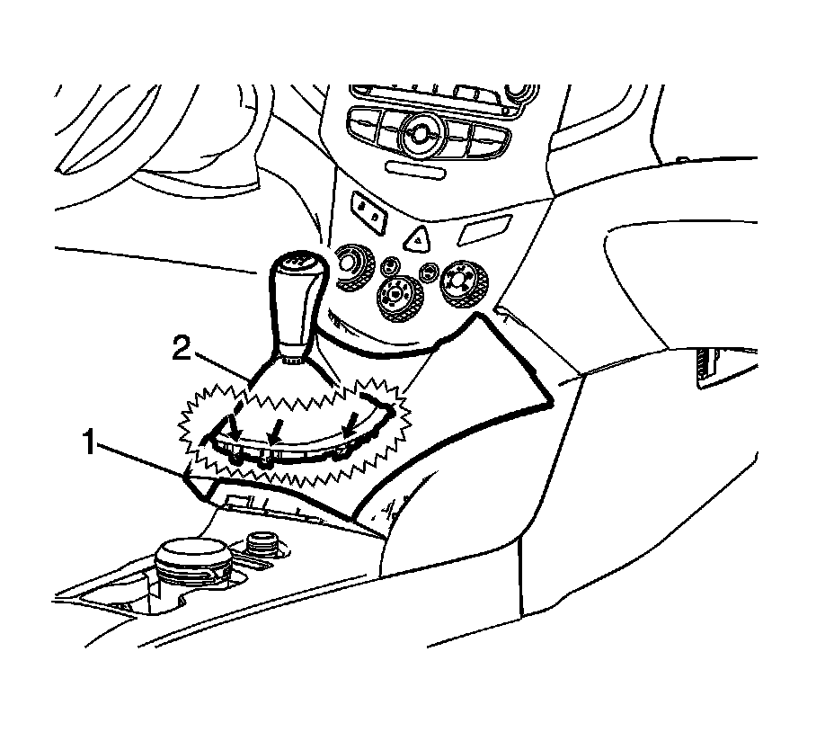 2. Reach under the console cover assembly (1) and release the retainer tabs securing the transmission shift lever boot (2) to the console cover assembly.