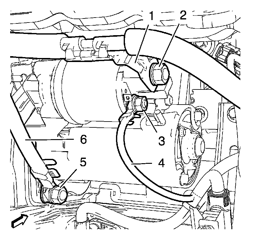 6. Remove the battery negative cable fastener (5) and the battery negative ground terminal (6), from the starter mounting stud.