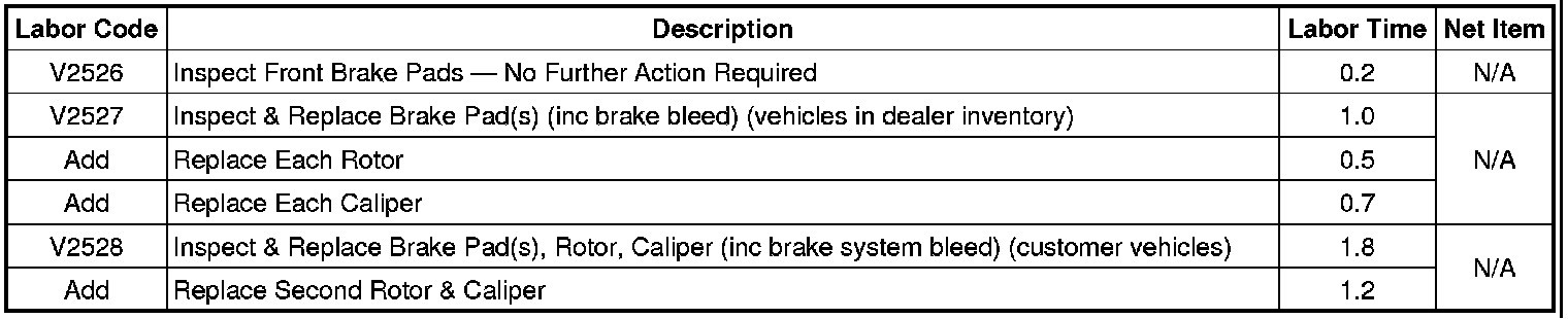 Dealers are to inspect the front brakes for missing inner or outer pads. If a brake pad is missing on a vehicle in dealer inventory, dealers are to install new inner and outer pads and, as necessary, install a new brake caliper assembly and/or brake rotor. If a brake pad is missing on a vehicle delivered to the customer, dealers are to install new inner and outer pads, a new brake caliper, and a new brake rotor.