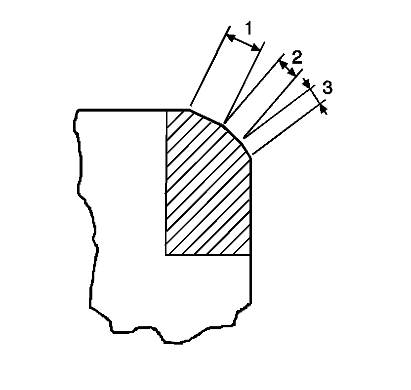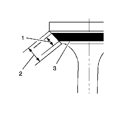 3. Using the proper angle specification listed in engine mechanical specifications, refer to Engine Mechanical Specifications Service Limits & General Specifications , grind, undercut, the valve seats (3) to narrow the valve seat widths to the specifications, refer to Engine Mechanical Specifications Service Limits & General Specifications.