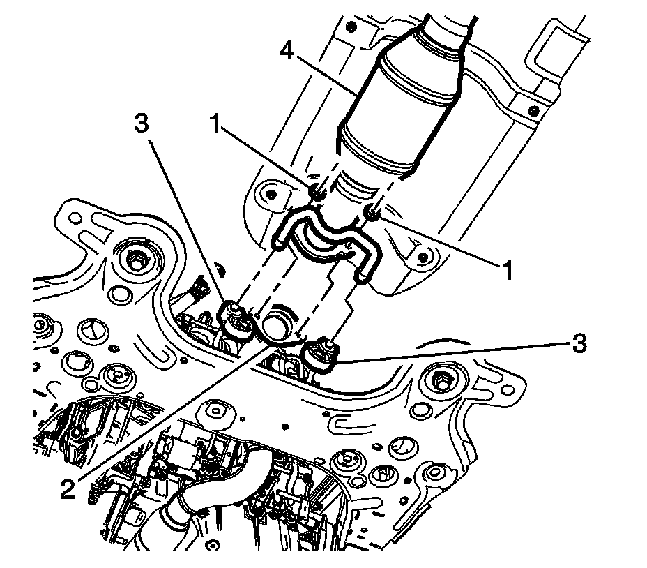 2. Install the 3-way catalytic converter (4) to the exhaust isolators (3) and tighten the fasteners (1) to 17 Nm (13 lb ft).