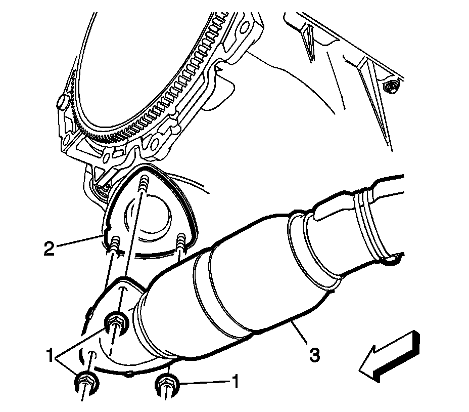 6. Remove the front pipe (3) from the catalytic converter and discard the exhaust gasket (2).