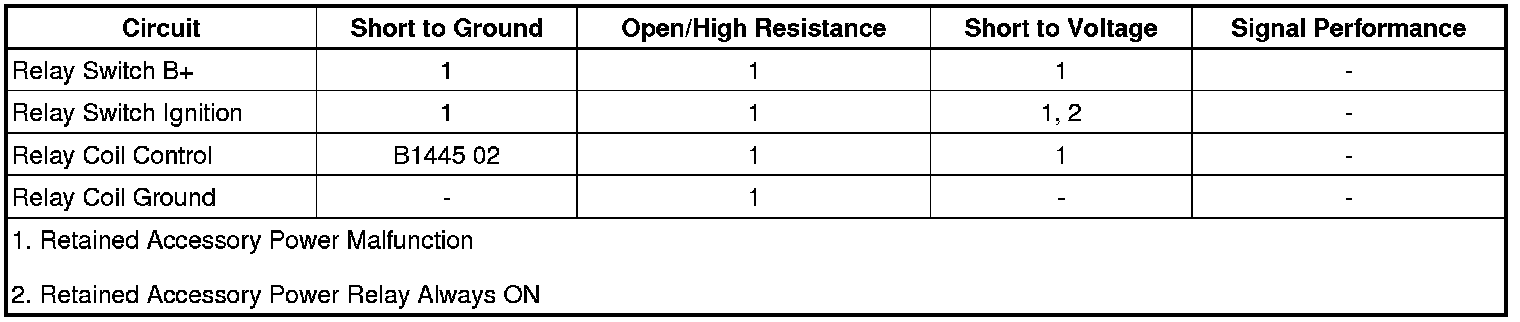 The body control module (BCM) controls the retained accessory power relay through the control circuit by applying voltage to the retained accessory power relay coil control circuit. The retained accessory power relay is energized when the ignition switch is in the ACCESSORY or the ON position.