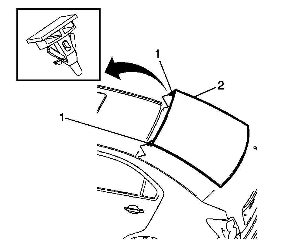 9. With an assistant, remove the window (2) from the vehicle. Check that the retainers (1) are still attached to the window before installing.