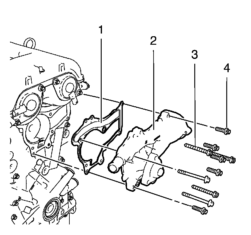 bolts (4) and the 5 long water pump bolts (3).