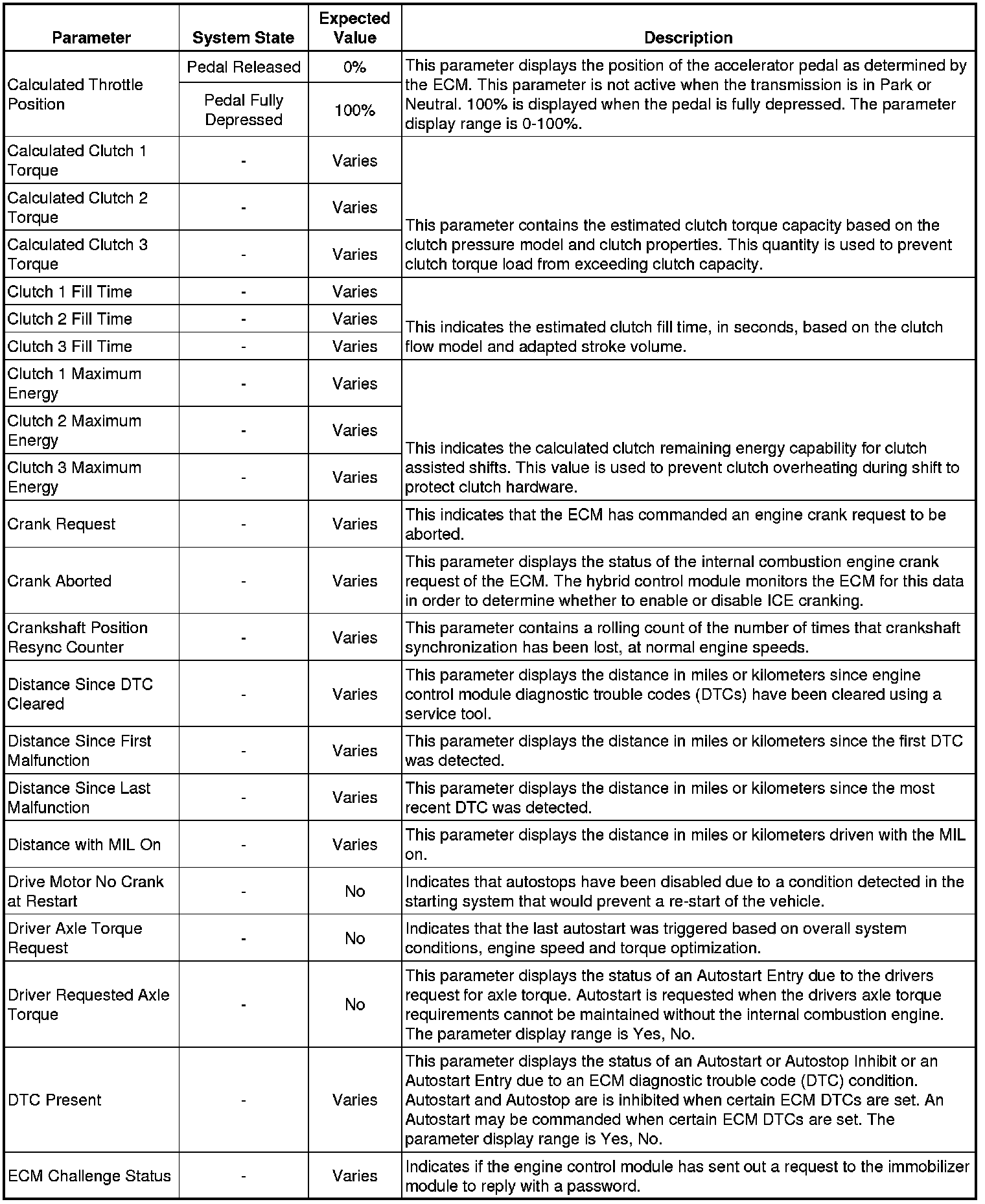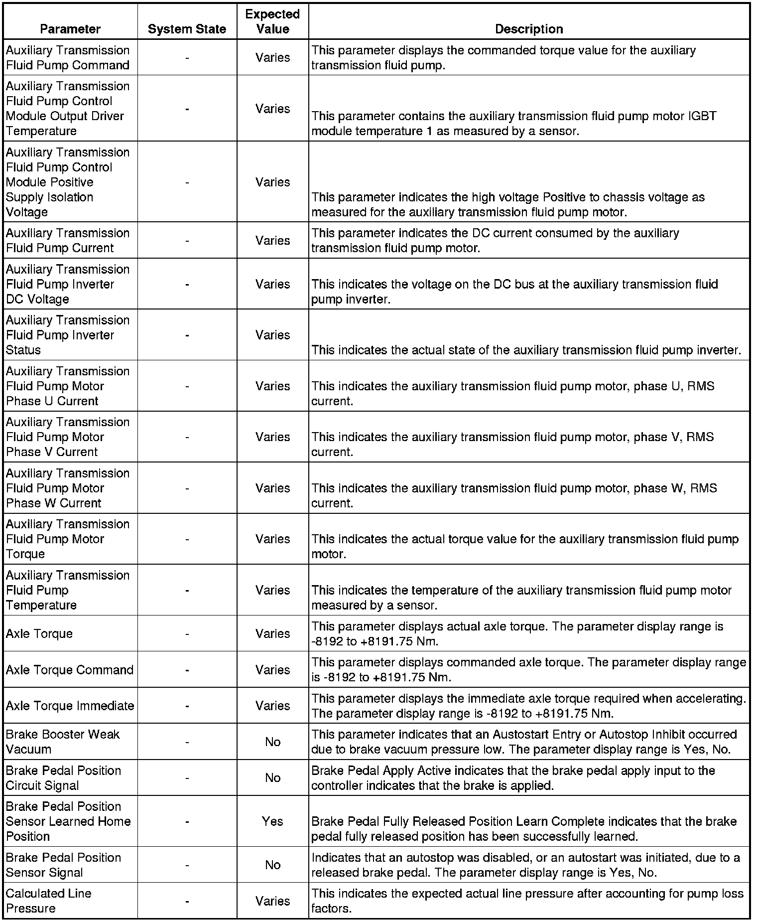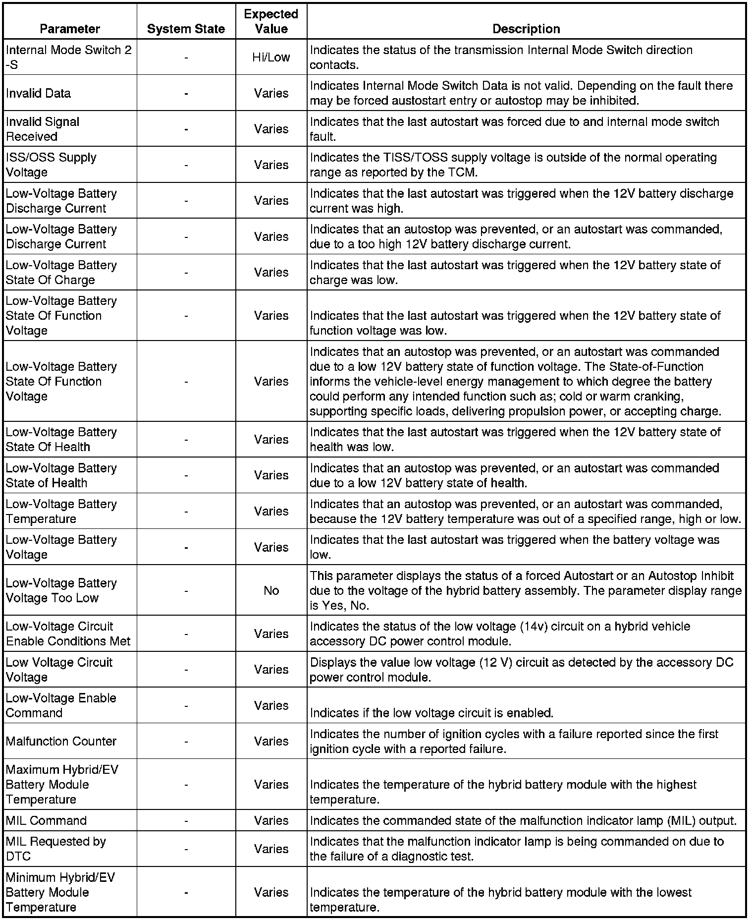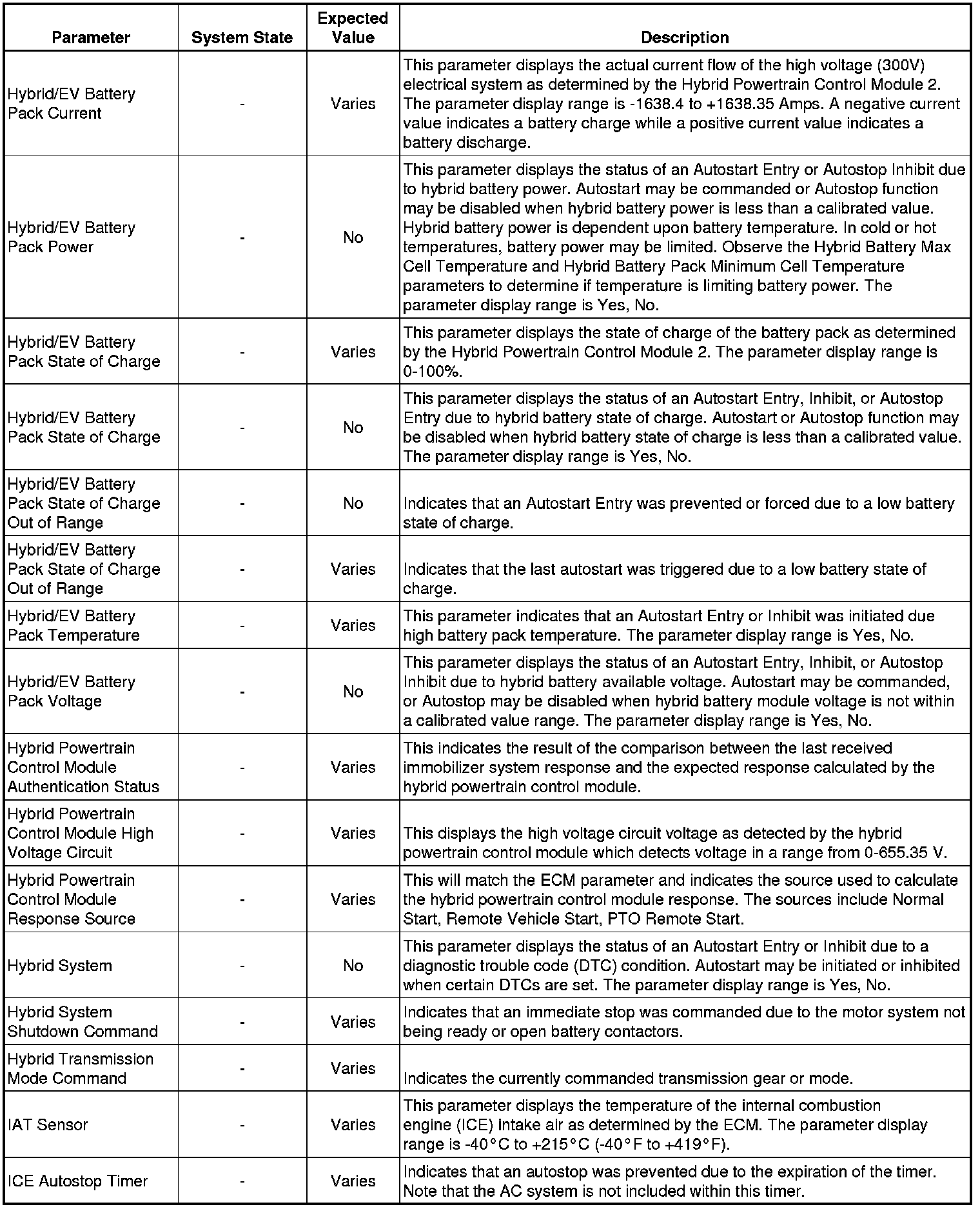 Only the parameters listed below are referenced in this service manual for use in diagnosis. If all values are within the typical range described below, refer to Symptoms - Hybrid Controls Symptoms - Hybrid Controls for diagnosis.