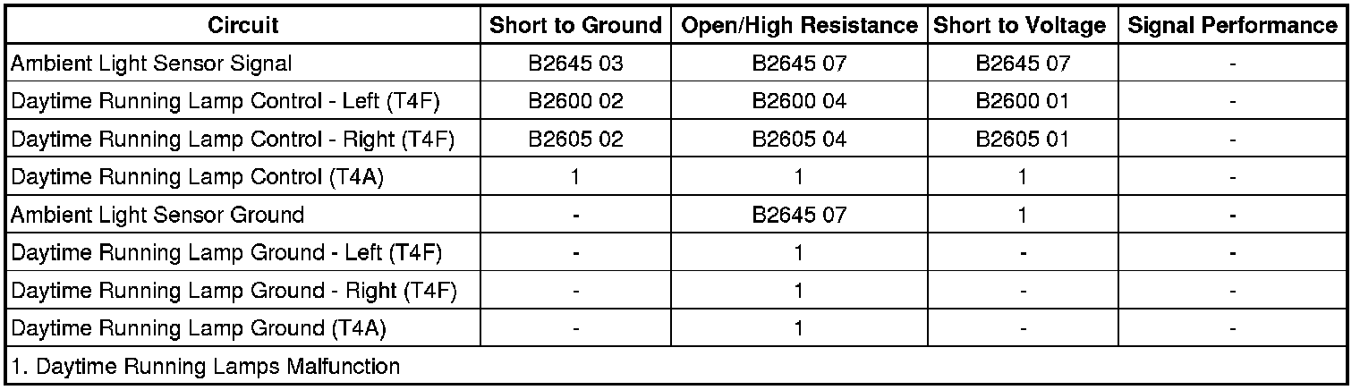 The ambient light sensor is used to monitor outside lighting conditions. The ambient light sensor provides a voltage signal that will vary between 0.2 and 4.9 V depending on outside lighting conditions. The body control module (BCM) provides a 5 V reference signal to the ambient light sensor which is permanently grounded. The BCM monitors the ambient light sensor signal circuit to determine if outside lighting conditions are correct for either daytime running lights (DRL) or automatic headlamp system control when the headlamp switch is in the AUTO position. In daylight conditions, the BCM will command the DRLs ON by applying a pulse width modulated (PWM) voltage to the left and right DRL control circuits illuminating the DRLs. Any function or condition that turns on the headlamps will cancel DRL operation.