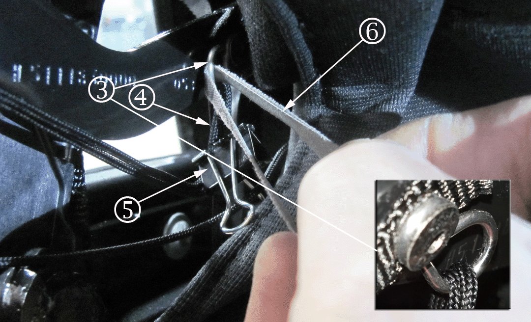 4. Pull down on the rear eye loop cord (4) and secure it with a binder clip (5) or equivalent to expose the inside surface of the rear eye loop.