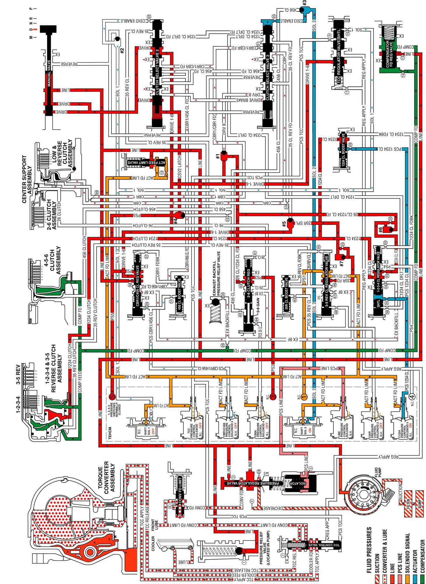 CBR1/C456 clutch regulator valve spring force moves the valve to exhaust the CBR1/456 clutch feed circuit and allow drive 1-6 fluid to enter the PS5 fluid circuit. PS5 fluid is then routed to the normally-closed pressure switch 5 and opens the switch. PS5 fluid is also routed to the #4 ball check valve and flows into the CSV2 latch fluid circuit.