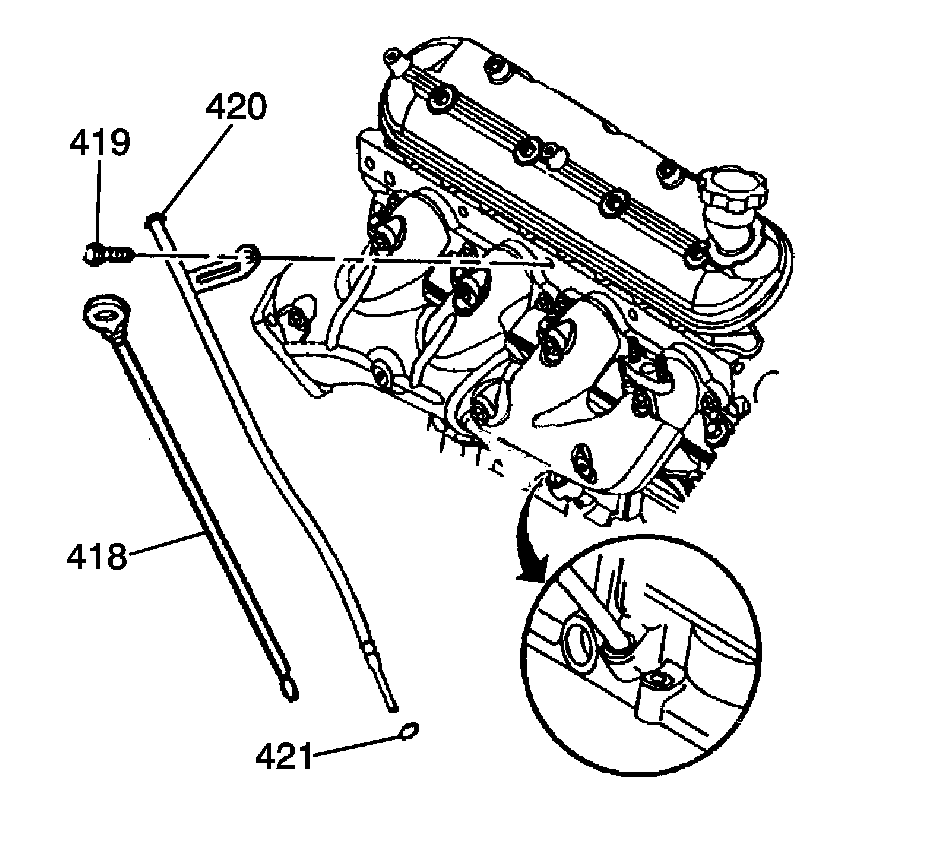 6. Install the oil level indicator (418) into the tube.