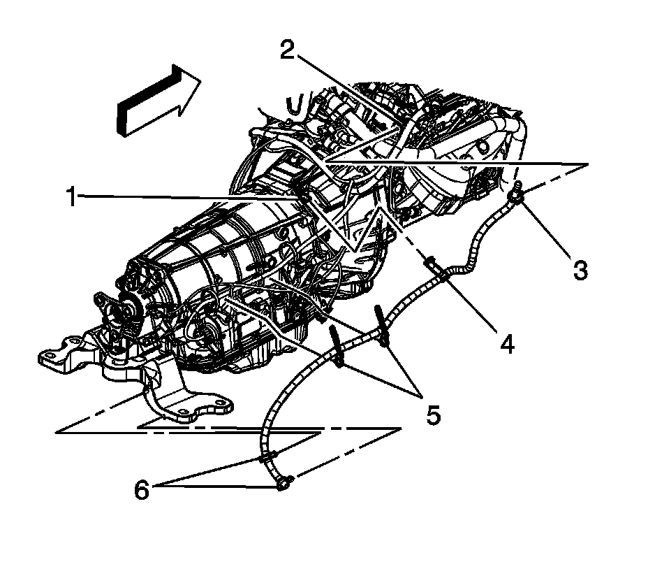 20. Install the transmission vent hose to the retaining clips (6) on the transmission support.