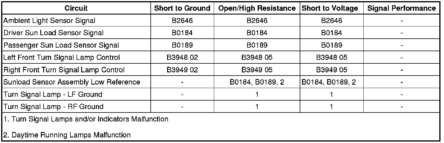 The ambient light sensor is used to monitor outside lighting conditions. The ambient light sensor provides a voltage signal that will vary between 0.2-4.9 volts depending on outside lighting conditions. The HVAC control module provides a low reference ground and a 5 V reference signal to the ambient light sensor. The HVAC control module monitors the ambient light sensor signal circuit to determine if outside lighting conditions are correct for either daytime running lights (DRL) or automatic lamp control (ALC) when the headlamp switch is in the AUTO position. The HVAC control module sends a signal to the body control module (BCM) via serial data commanding the BCM to turn the front turn signal lamps on steady (non-flashing). Any function or condition that turns on the headlamps will cancel the DRL operation. With the turn signal/multifunction switch in the OFF position, the turn signal lamps will either be turned ON or OFF after a 30-second delay, depending on whether daylight or low light conditions are sensed by the ambient light sensor.
