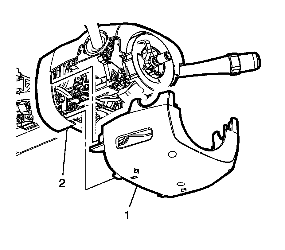 3. Separate the lower steering column trim cover (1) tabs from the upper steering column trim cover and the slots in the steering column housing trim extension cover (2).