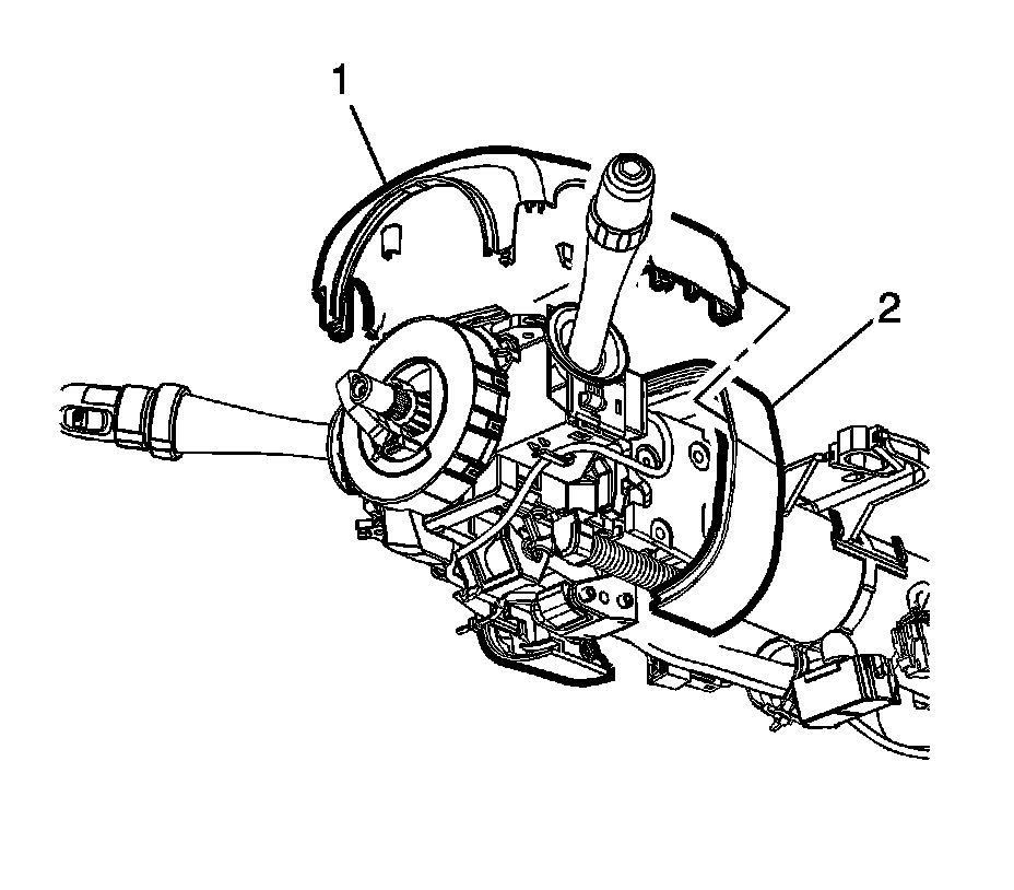 5. Verify that the tabs on the lower steering column trim cover (1) are fully engaged in the upper steering column trim cover and the slots in the steering column housing trim extension cover (2).