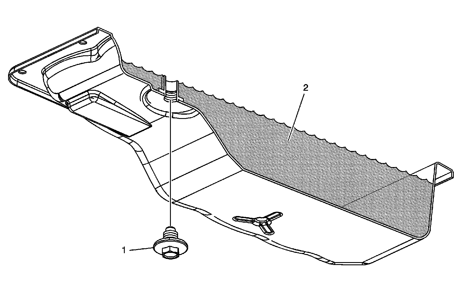6. Remove the trans oil level check plug (1) from the transmission fluid pan. Allow any fluid (2) to drain.