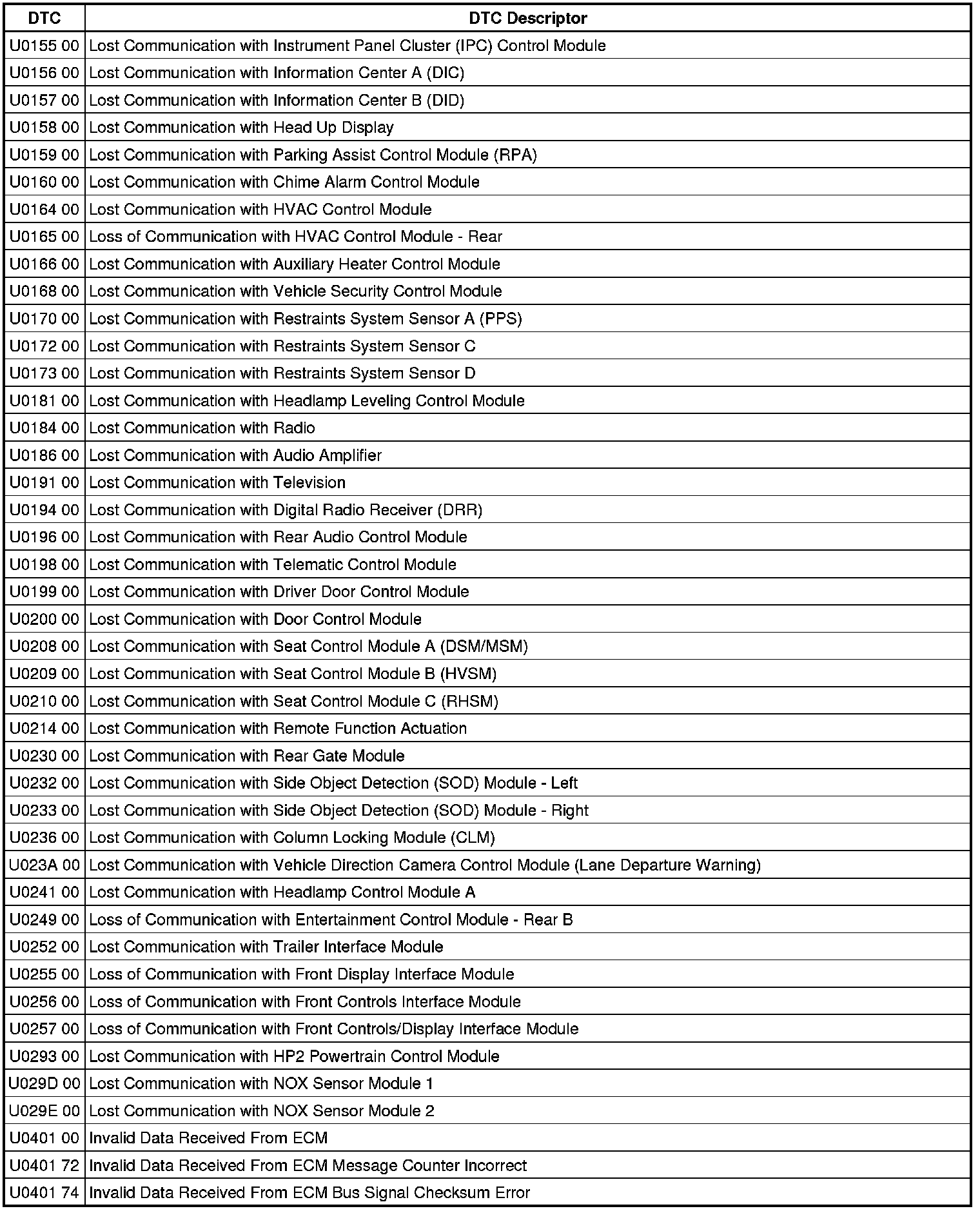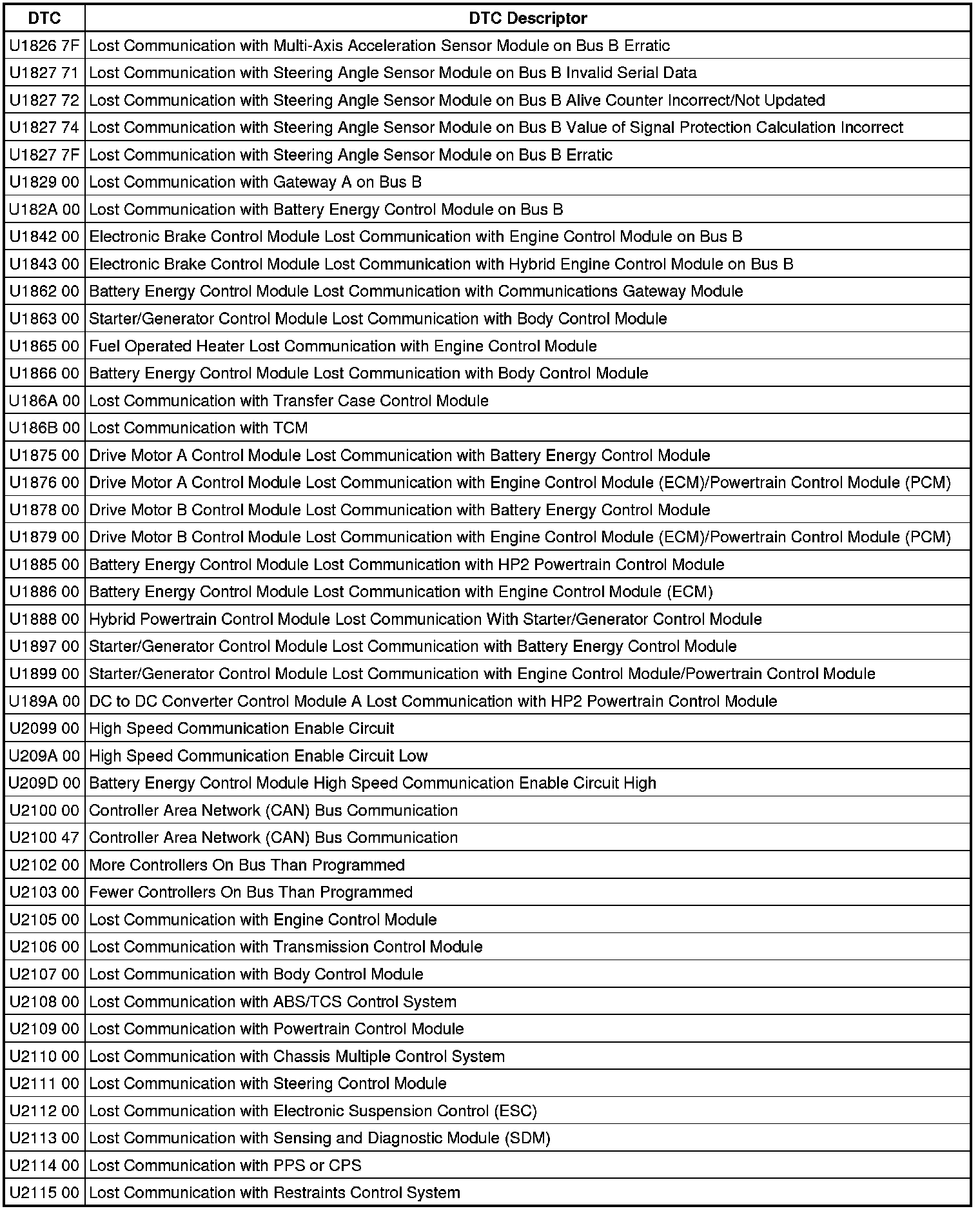 This list includes all Data Communications related U-code DTCs in alphanumeric order with descriptors for all modules. Not all DTCs listed will be applicable to all vehicles.