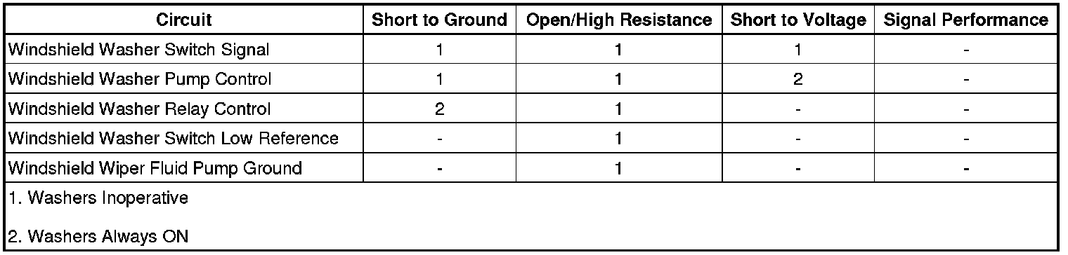 • If it does not activate, test the control circuit for an open/high resistance. If the circuit tests normal, test or replace the Windshield Washer Fluid Pump.