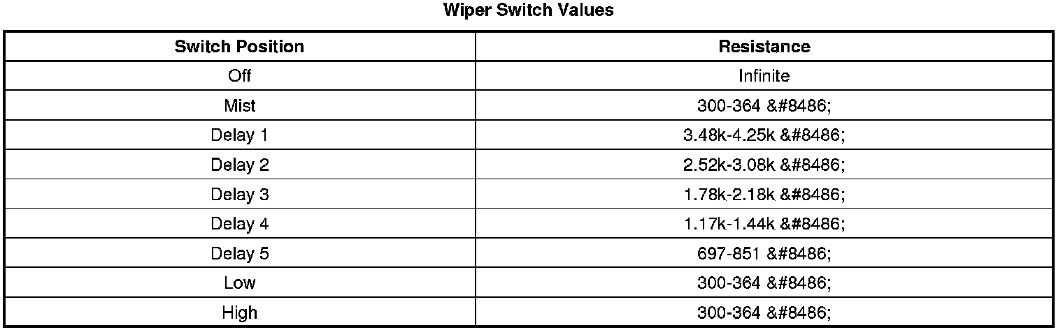 3. While cycling the wiper switch through each delay and speed position, test for the specified resistance between the low reference terminal M and the signal terminal N.