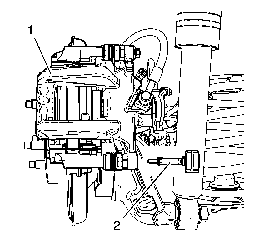 Support the brake caliper with heavy mechanic wire, or equivalent, whenever it is separated from its mount and the hydraulic flexible brake hose is still connected. Failure to support the caliper in this manner will cause the flexible brake hose to bear the weight of the caliper, which may cause damage to the brake hose and in turn may cause a brake fluid leak.