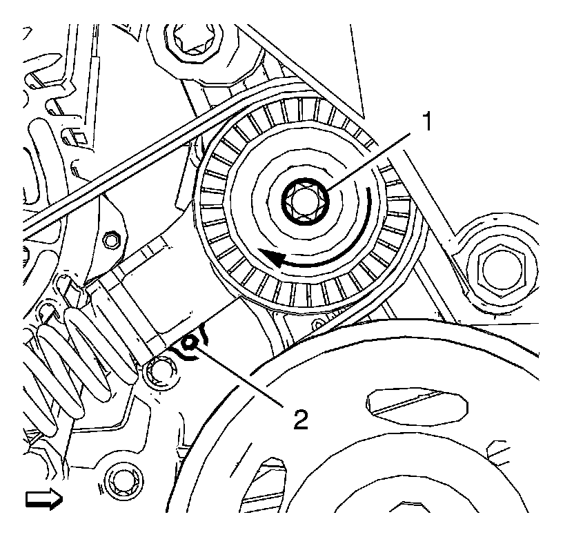 3. Rotate the drive belt tensioner pulley bolt (1) in the direction shown until the bore (2) aligns with the bore in the engine front cover, using a TORX wrench and hold in position.