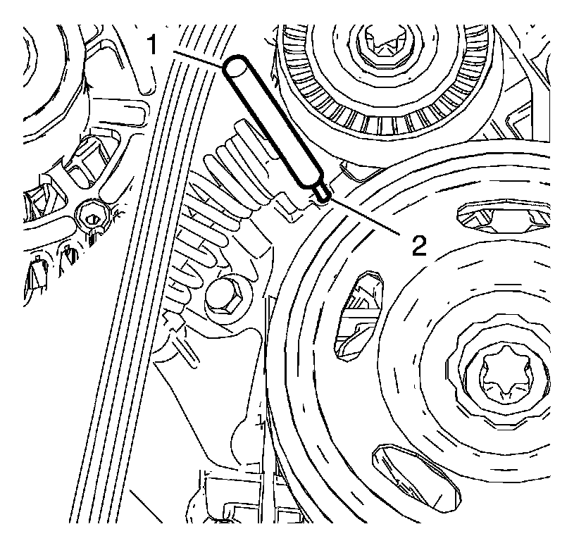 5. Remove the punch (1) from the engine front cover bore and the drive belt tensioner bore (2).