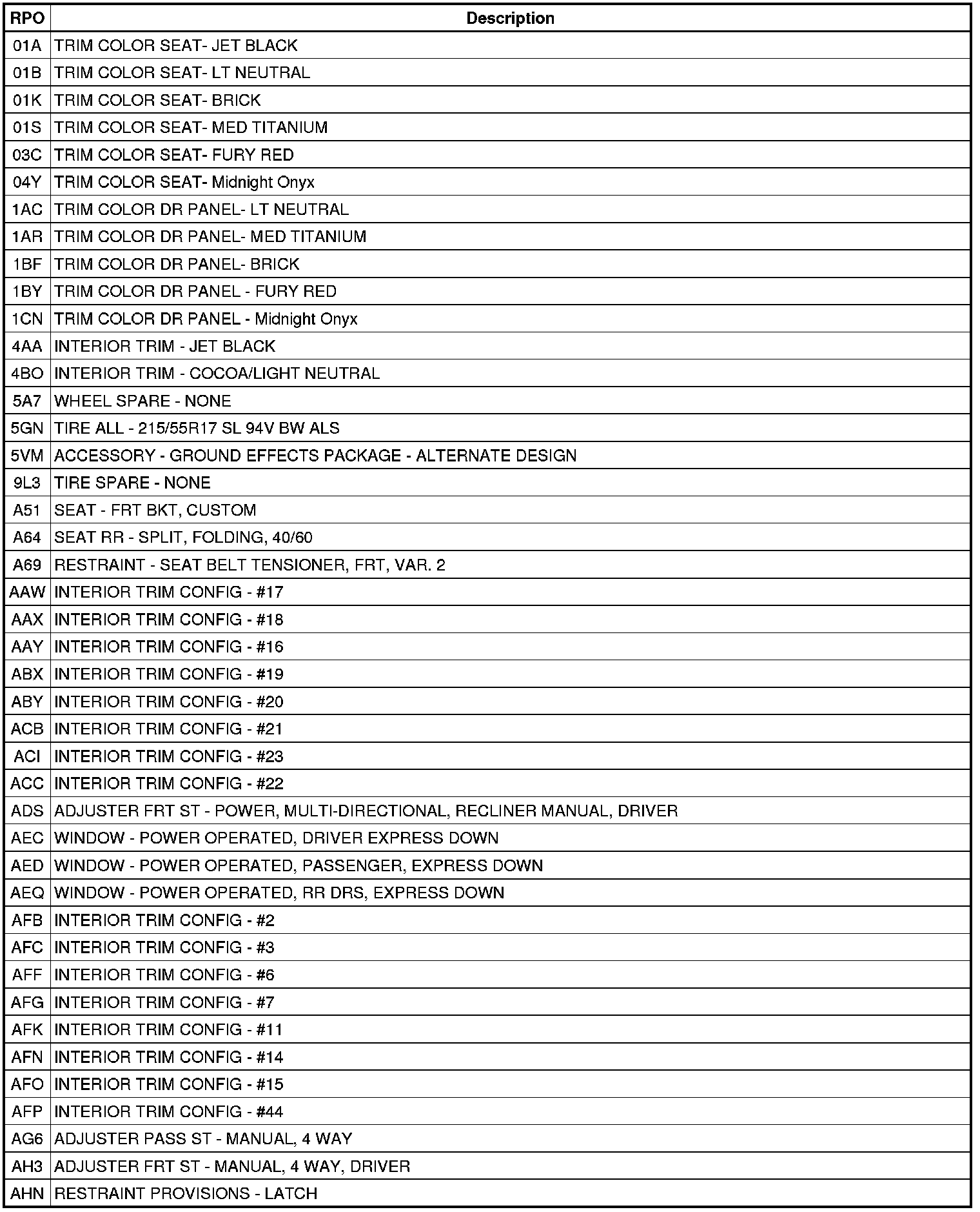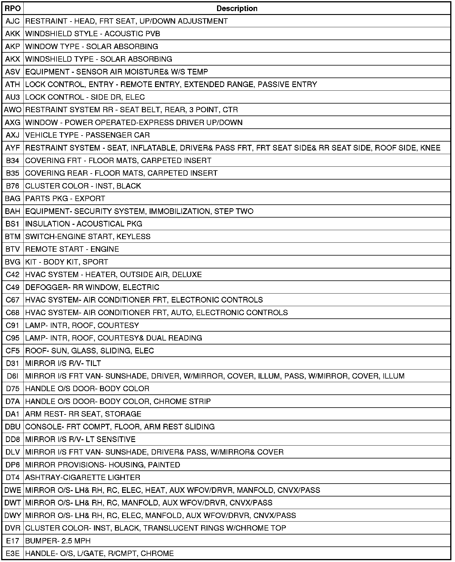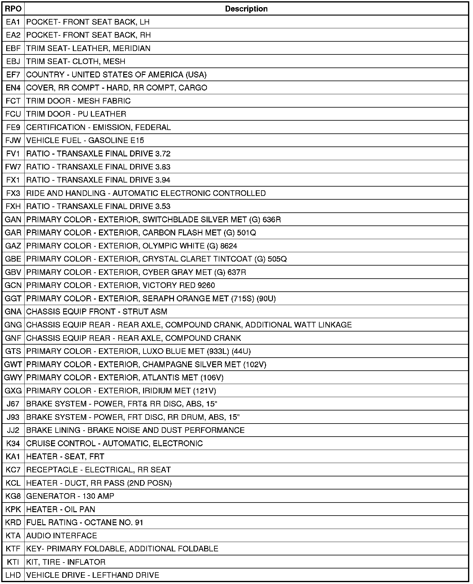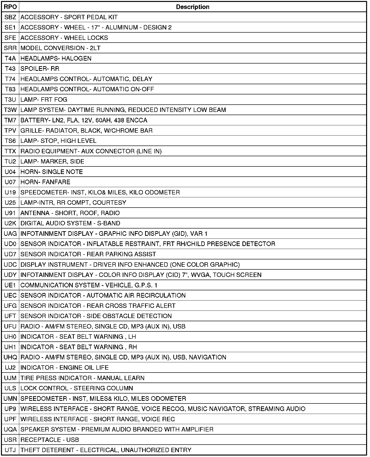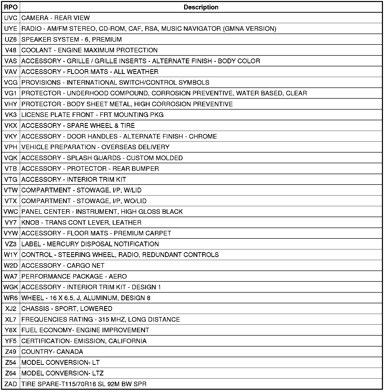 The following table provides the description of the Regular Production Option (RPO) codes that are available on the vehicle. The vehicle's RPO list is printed on the Service Parts Identification Label.