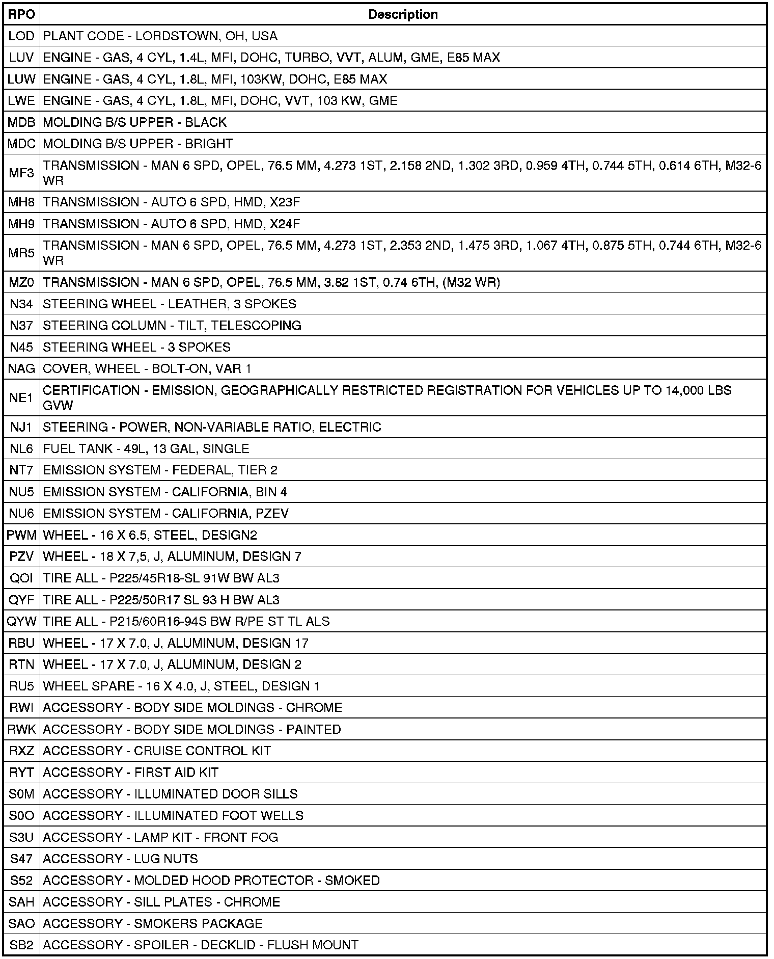RPO Code List