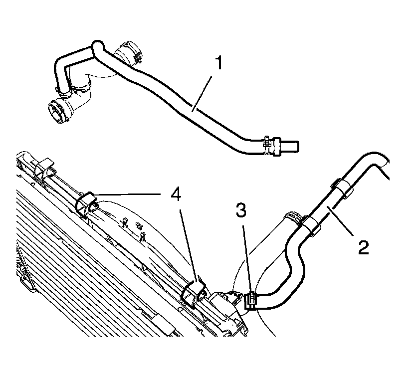 1. Clip in the radiator outlet hose (1) into the 2 clips (4).