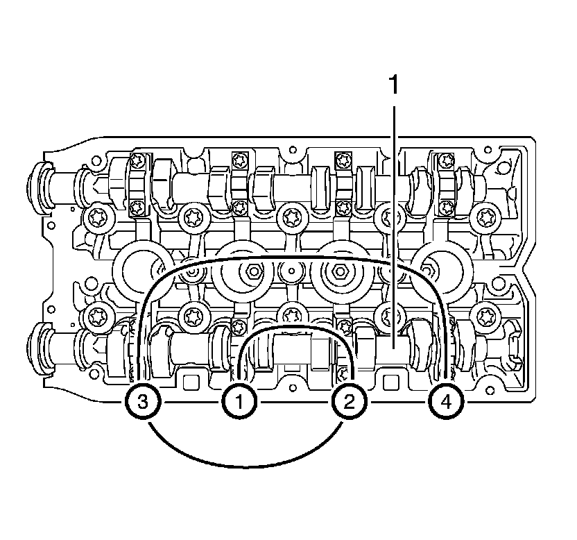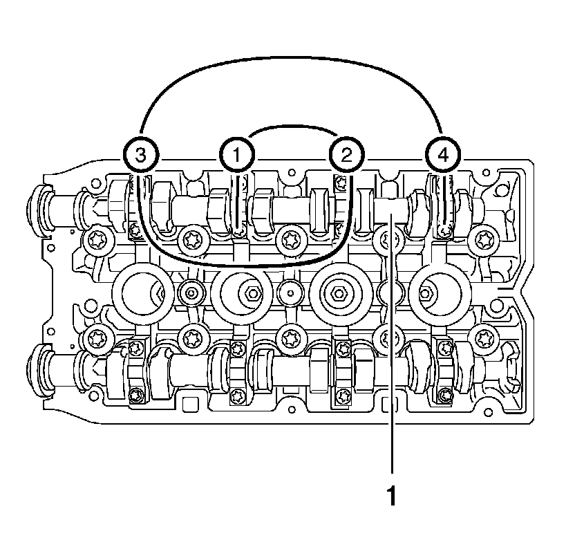 11. Install the first camshaft bearing cap (1) bolts and tighten to 8 Nm (71 lb in).