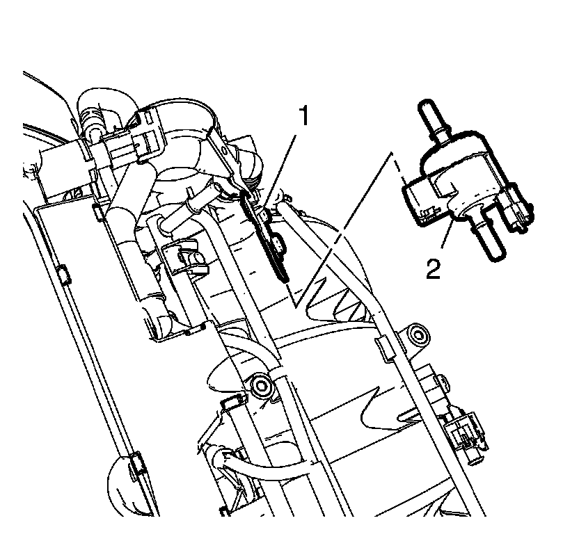8. Remove the evaporative emission canister purge solenoid valve (2) from the bracket (1).