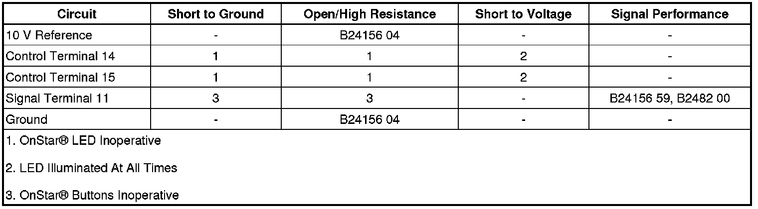 The OnStar(R) status LEDs are located in the inside rearview mirror telematic button assembly. The green LED is illuminated when the system is ON and operating normally. When the green LED is green and flashing, it is an indication that a call is in progress. When the red LED is illuminated, a system malfunction is present. In the event there is a system malfunction and the OnStar(R) system is still able to make a call, the LED will flash red during the call. The OnStar(R) LEDs are controlled by the telematics communication interface control module via the keypad green LED control circuit and the keypad red LED control circuit.