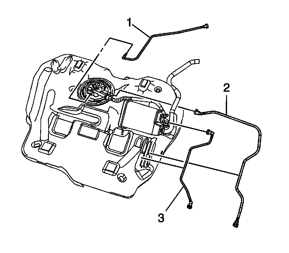 3. Install and connect the fuel feed line (2), and the EVAP lines (1, 3). Refer to Plastic Collar Quick Connect Fitting Service Service and Repair.