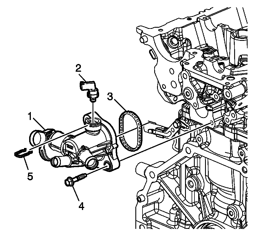 4. Install a NEW thermostat assembly gasket (4) and the thermostat assembly (2).